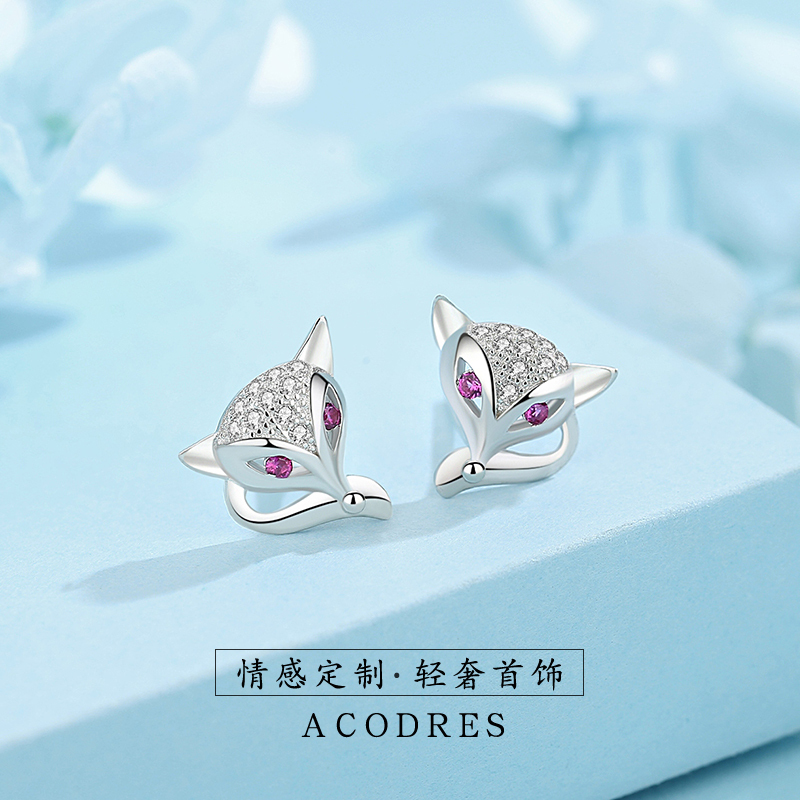 鑫铂尼925银立体小狐狸耳钉气质百搭个性银饰品七夕情人节生日礼送女友