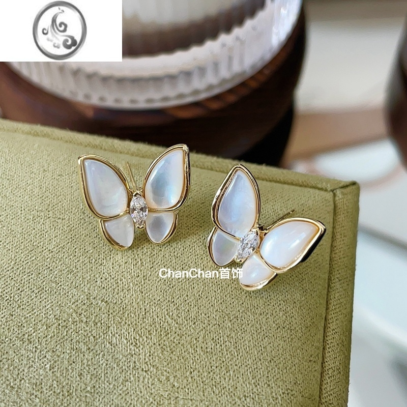 JiMi质感轻奢白贝母半钻蝴蝶耳钉女2023新款温柔气质甜美百搭银针耳饰