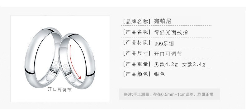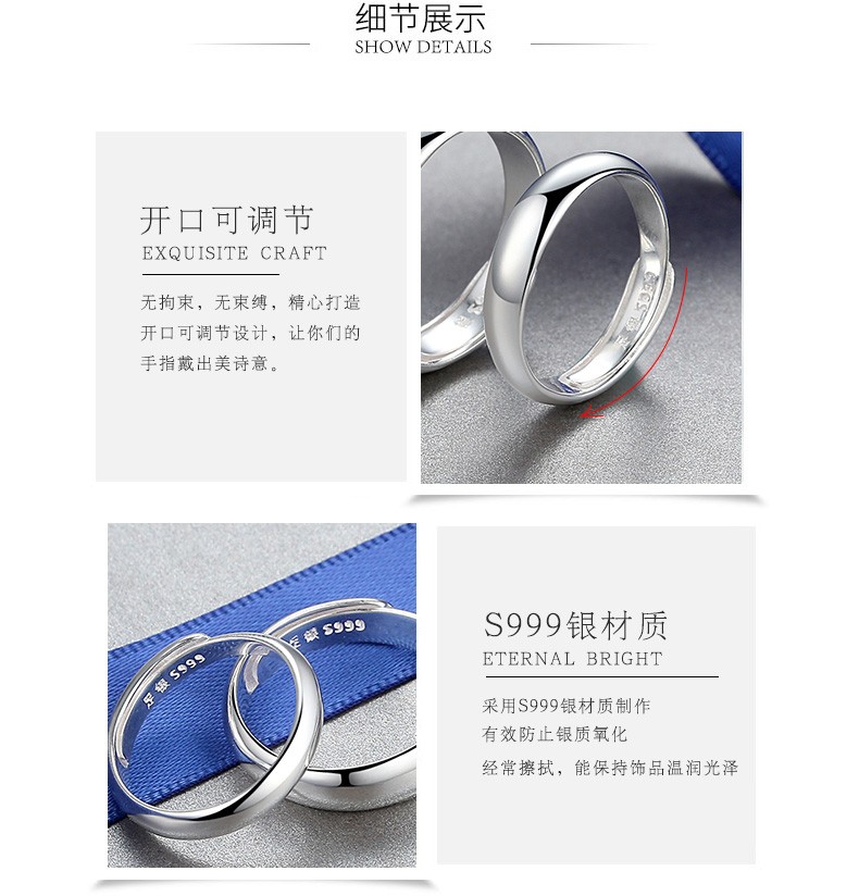 鑫铂尼999纯银情侣戒指男女对戒一对开口简约闺蜜女生银饰戒子时尚饰品首饰结婚订婚520情人节生日礼物送男友女友 钟久久