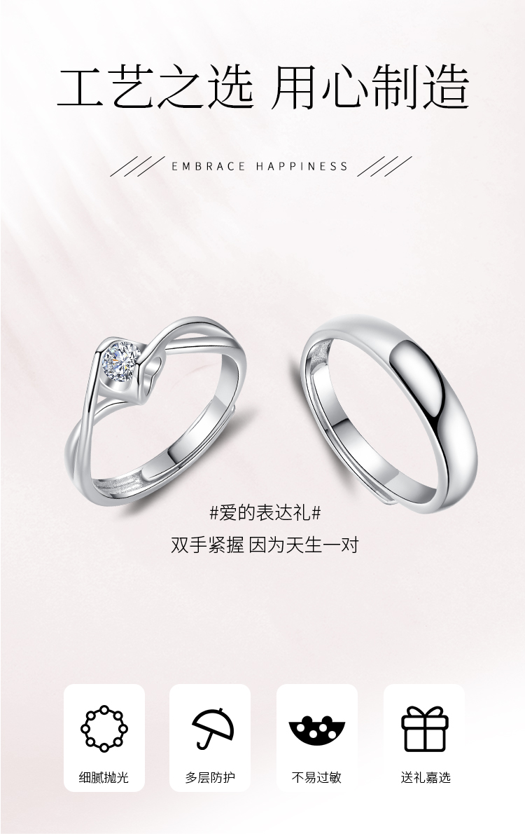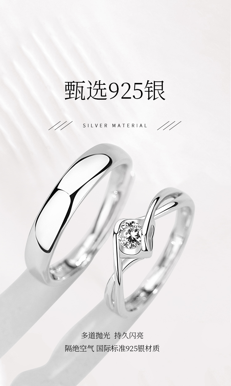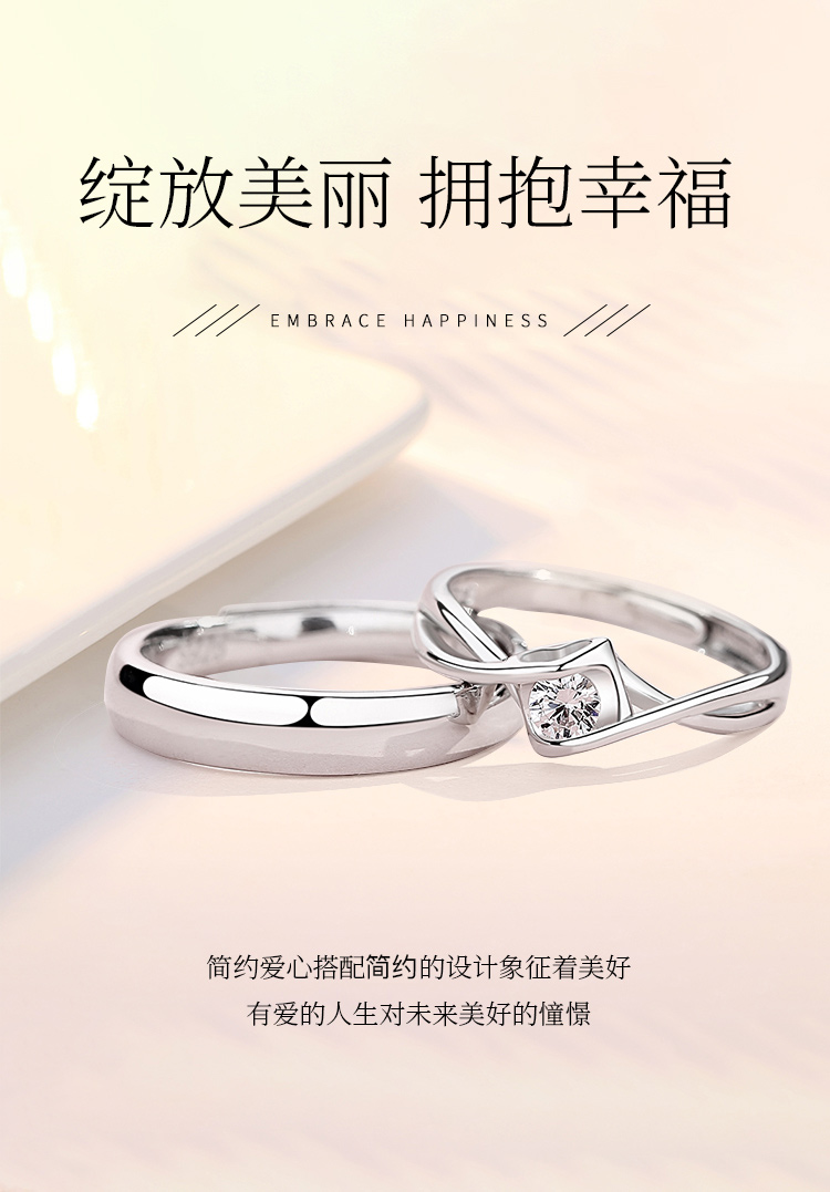 鑫铂尼S925纯银情侣对戒 情侣戒指活口一对 男女士银戒指情人节 开口指环纪念日 钟久久戒指520情人节礼物送男友女友 天生一对情侣戒指