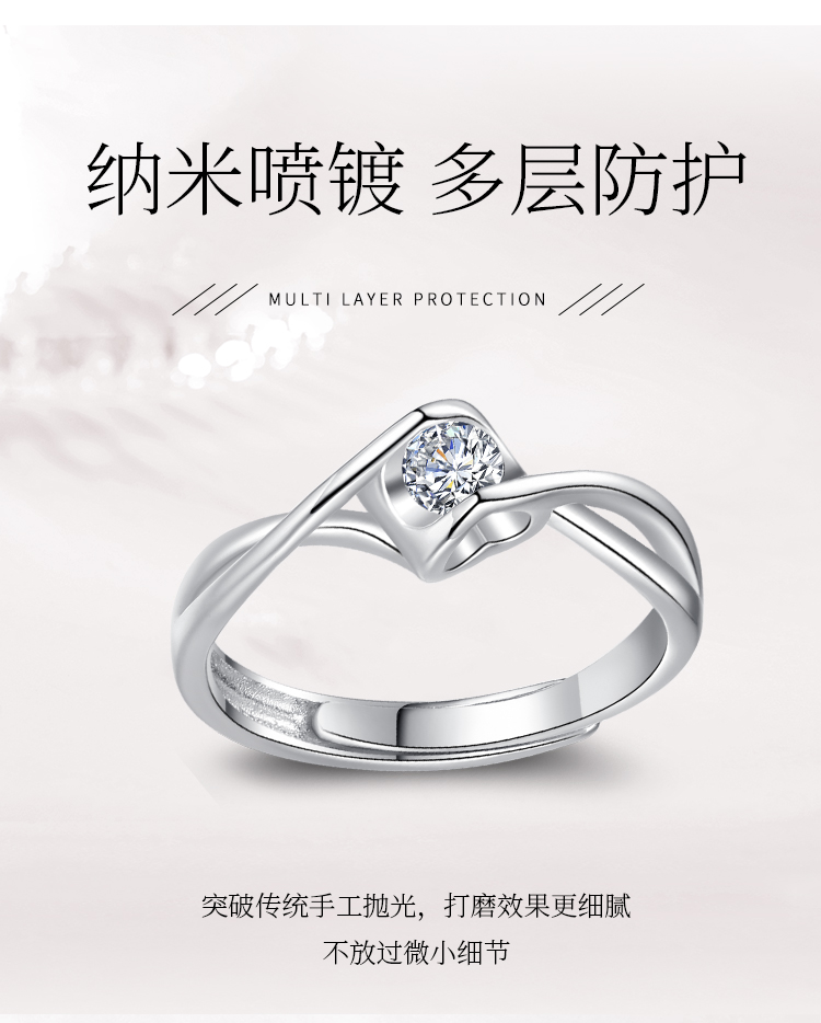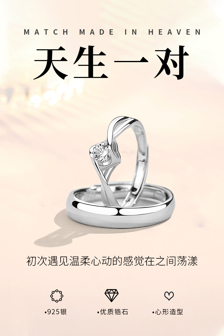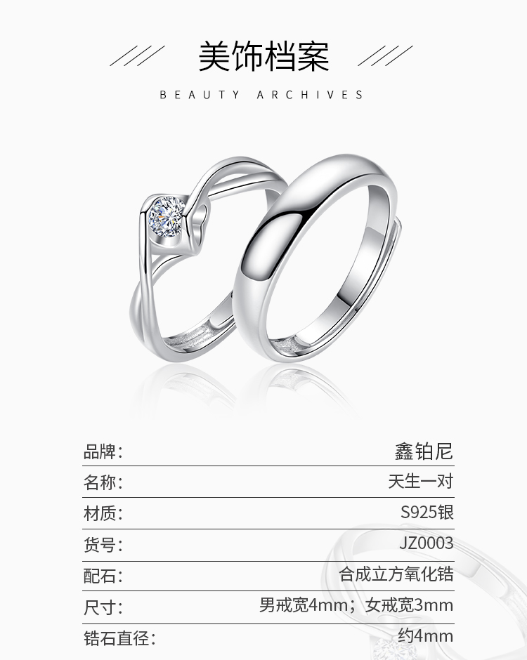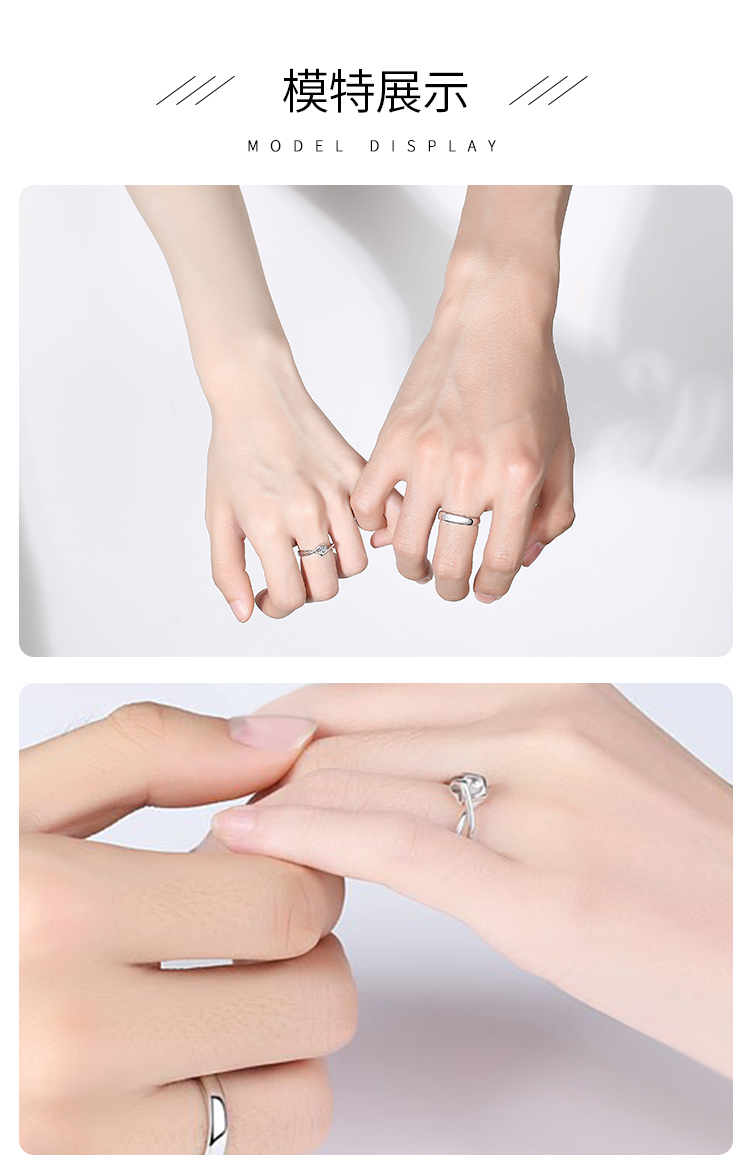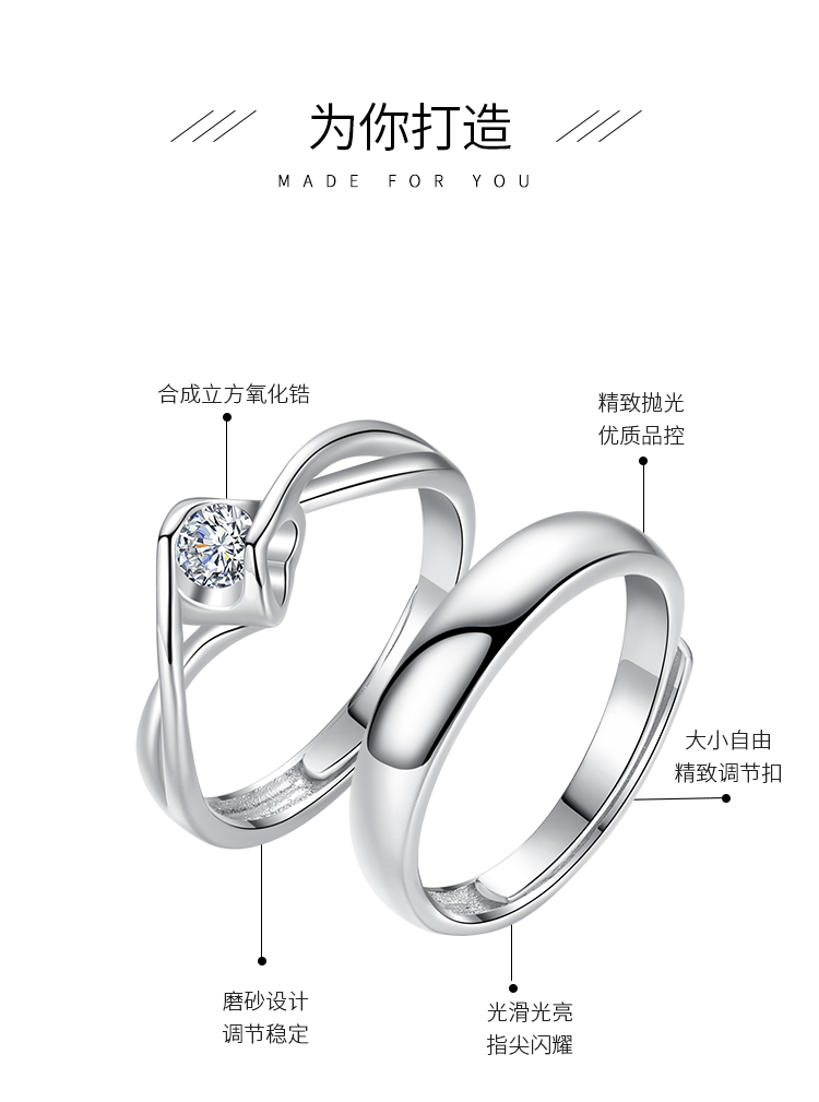 鑫铂尼S925纯银情侣对戒 情侣戒指活口一对 男女士银戒指情人节 开口指环纪念日 钟久久戒指520情人节礼物送男友女友 天生一对情侣戒指